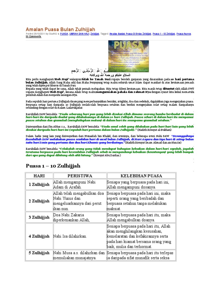 Keutamaan dan amalan di 10 hari pertama bulan dzulhijjah. Berikut adalah beberapa amalan dan refleksi diri yang kita boleh amalkan di dalam bulan yang mulia ini. Ustadz muhammad ajib dalam buku fikih kurban perspektif mazhab syafi'i terbitan rumah fiqih publishing menjelaskan, ada beberapa amalan khusus yang bisa dilakukan di bulan dzulhijjah. Tarikh puasa sunat hari arafah tahun 2021/1442h malaysia. Hidupkan malamnya dengan banyak beribadat: Zikir 10 zulhijjahzikir bulan zulhijjahzikir 10 hari zulhijjahzikir di bulan zulhijjahzikir pada 9 zulhijjahzikir 10 awal zulhijjahamalan zulhijjahzikir baru. Dalam sembilan hari tersebut, ada 2 ibadah puasa sunah yang harus kamu ketahui, yakni puasa tarwiyah (dilaksanakan pada 8 zulhijjah) dan puasa arafah (dilaksanakan pada 9 zulhijjah). Dan seperti juga ramadhan, bulan ini mempunyai keistimewaannya yang tersendiri terutamanya pada 10 hari pertama tersebut. Ambil kesempatan ini untuk meningkatkan ketakqawaan kepada allah dengan melipatkan gandakan amalan di 10 malam pertama zulhijjah. Di antaranya puasa, ibadah haji, qurban, dzikir, dan sholat. Zulhijjah merupakan bulan terakhir di dalam kalendar takwim hijrah. Ada 6 amalan yang kami akan jelaskan dengan singkat berikut ini. Ini disokong oleh hadis baginda rasulullah.