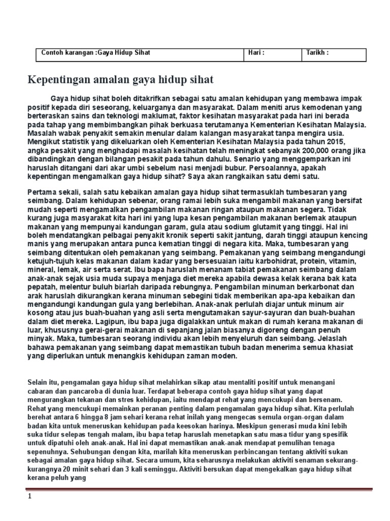 Dengan mengamalkan pengambilan makanan seimbang serta amalan bersenam dan beriadah secara konsisten ini, sekaligus dapat membakar kalori dalam badan dan juga mengu rangkan masalah peningkatan berat badan. Huraikan pendapat anda tentang amalan gaya hidup sihat yang sewajarnya dipraktikkan oleh setiap individu.panjangnya huraian hendaklah antara 200 hingga 250 patah perkataan. Cara mengamalkan gaya hidup sihat contoh karangan from www.ipendidikan.my contoh karangan amalan gaya hidup sihat mp3 & mp4. Gaya hidup sihat bolehlah ditakrifkan sebagai satu amalan kehidupan yang membawa impak positif kepada diri seseorang, keluarganya dan masyarakat. Amalan gaya hidup sihat adalah cara hidup yang boleh mengurangkan pelbagai risiko penyakit pada masa hadapan.
